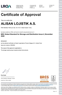 Uluslararası standartlarda sunduğu hizmetlerle adından sıkça söz ettiren lojistik sektörünün öncü firmalarından Alışan Lojistik, “BRCGS Depolama ve Dağıtım Standardı” gerekliliklerini yerine getirerek tüm dünyada geçerli gıda güvenliği standardı olan ve bu konuda dünyanın en önemli belgesi şeklinde adlandırılan “Gıda Güvenliği Belgesi”ni “A” seviyesinde almaya hak kazandı.