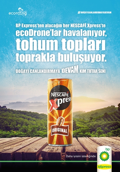 bp Türkiye, Nestlé ve ecording’in birlikte gerçekleştirdiği iş birliği kapsamında Temmuz ve Ağustos ayı boyunca bp Express marketlerinde satılan her Nescafé Xpress, doğaya tohum topu olarak geri dönecek. Daha yeşil bir dünya ve sürdürülebilir bir gelecek için hayata geçen kampanya kapsamında 100.000 adet tohum topu, ecording ile doğayla buluşacak. Proje ile bp Express marketlerinde yazın satın alınan her bir Nescafé Xpress ürünü için ecording’in ecoDrone’ları ile belirlenmiş doğal alanlara havadan tohum topu atışı gerçekleştirilecek.