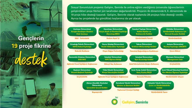 Üniversite çağındaki gençlere 21. yüzyılın gerektirdiği becerileri geliştirme, farklı kültürleri tanıma, dil engeli nedeniyle erişemedikleri bilgilere www.gelisimseninle.com üzerinden erişme fırsatı sunan ve iş dünyasına hazırlayan bp Türkiye’nin gençlik projesi Gelişim, Seninle bu yıl da sürüyor. Gençlerin gelişimini destekleyen sosyal sorumluluk projesi Gelişim, Seninle’nin ikinci döneminin kazananları danışma kurulunca belirlenirken, Türkiye’nin pek çok farklı üniversite topluluğundan online eğitimleri tamamlamış öğrencilerin BM Sürdürebilir Kalkınma Amaçları doğrultusunda projelendirdiği 19 sosyal fayda odaklı çalışma hibe desteği almaya hak kazandı.