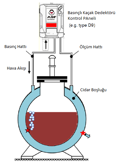 ( basınç hattı ) ve aynı şekilde uygun basınç hortumu ile cidar arasında oluşan basınç tekrar panel’e bağlanarak ( ölçüm hattı ) sürekli ölçülebilir bir yapı oluşturulmaktadır. Cidar arasına uygulanan basınç operasyonel değeri 450 mB olup sürekli ölçülen bu basınç değeri 375 mB altına düşmesi durumunda kontrol paneli sesli ve görsel olarak alarm üretecek ve kullanıcıları uyaracaktır.
