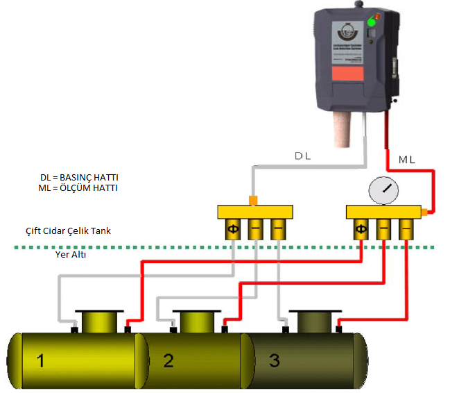 Çalışma prensibini biraz daha açıklamak gerekir ise, cidar arasına uygulanan basınç miktarı tank içinde oluşabilecek maksimum hidrostatik basınçtan yüksektir. Tank cidarında sıvının alt noktası ya da üst noktası fark etmeksizin bir kaçak oluşması durumunda cidar arasındaki basınç düşecektir ve sonuucnda sistem alarm oluşturacaktır. Ayrıca cidar arasında ki basınç tank içindeki hidrostatik basınçtan yüksek olduğu için kaçak durumunda depolanan sıvının dışarı çıkması veya cidar arasına dolması engellenmiş olur. Cidar arasında oluşan çok küçük kaçaklar yada sıcaklığa bağlı basınç değişimleri kontrol panelinde bulunan dahili pompa ile kompanze edilir, oluşan büyük kaçaklar da ise cidar arası basınç yavaşça düşeceğinden panel üzerinde alarm aktif hale gelecektir. Şekilde görüldüğü üzere kullanılan bağlantı manifoltları ile tek bir paneli altı tanka kadar bağlamak mümkün. Yaşanan basınç kaybı ve oluşan alarm sonrası hangi tankta sorun olduğunu anlamak için bağlantı manifoltu üzerinde bulunan vanalar yardımı ile tanklar tek tek kontrol edilerek problemli tank kısa sürede tespit edilebilecektir. Montajı ve devreye alması son derece kolay olan bu sistem sayesinde sonucu ciddi olabilecek birçok emniyet, çevre ve maddi kayıpların , problemlerin önüne kolayca geçmek mümkün ve bunun için çok cüzi bir bütçe ayırmanız yeterli.