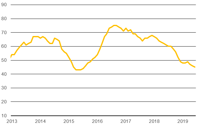 Japonya’dan farklı olarak Birleşik Krallık ticareti bir önceki güncellemede zaten aşağı yönlü bir eğilim kaydetmişti. Önümüzdeki üç ay için Birleşik Krallık’a dair öngörüler 4 puanlık gerilemeyle ilk kez eşiğin altına düştü ve 49 oldu. Görece dirençli geçen birkaç çeyreğin ardından bu gelişmenin, süregiden Brexit belirsizliğinin bir yansıması olduğu açık.
