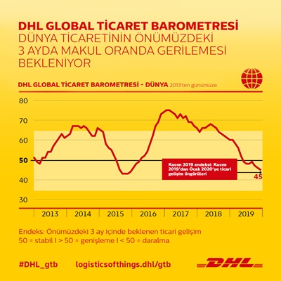 DHL Global Ticaret Barometresi Endeksi, Kasım 2019 itibarıyla 2 puan gerileyerek 45 oldu.