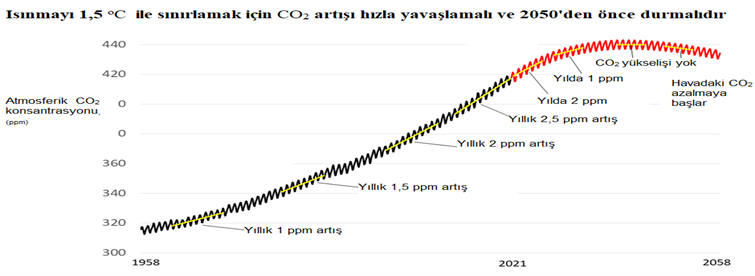 IPCC’nin (Hükümetler Arası İklim Değişikliği Paneli) küresel ısınmayı 1,5°C ile sınırlı tutmak için uzun vadede kullandığı senaryoda, öngörülen artış önümüzdeki beş yıl içinde yılda ortalama 2 ppm yavaşlayarak, son ortalama yıllık artıştan neredeyse %20 daha düşük. Bu senaryoya göre, CO2 salınımındaki hız yavaşlıyor ve ardından 2040’ların başında durma noktasına geliyor. Karbondioksit seviyeleri daha sonra bu senaryoda yüzyılın geri kalanında düşüyor. Bu düşüşü hızlandıran insan kaynaklı emisyonlar hızla düşüyor, yüzyılın ortalarında net sıfıra ulaşıyor ve bundan sonra negatif hale geliyor.