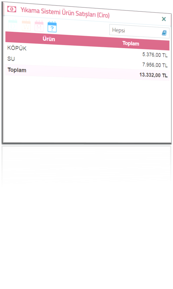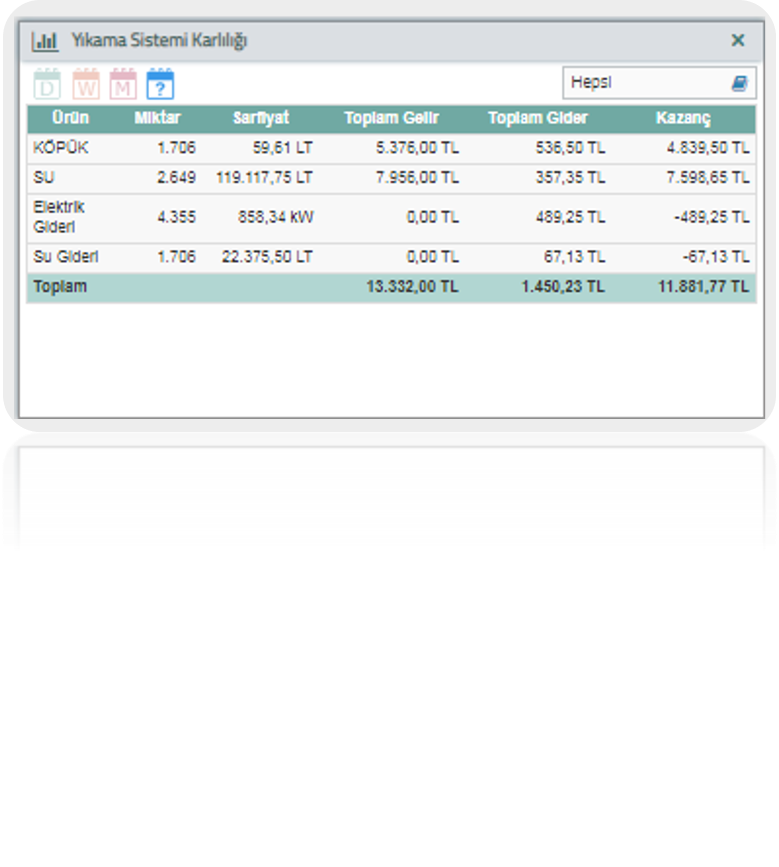 *Sisteme tanımlanan Elektrik (Kw), Su  (m3) ve Köpük (Lt) maliyetlerinin,  sistemin her operasyon başına     gerçekleştirdiği hesaplama algoritması  sayesinde hem maliyetlerinizi hem de  kazançlarınızı izleyebilir ve raporlayabilirsiniz.