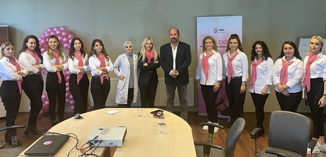 Başta kadın bir yönetici, eski bir sağlık yöneticisi ve geleceğin mimarı kadınların her platformda güçlü olması gerektiğini savunan şirket kültürünün bir parçası olduğu için bu farkındalık projesini geliştirdiğini ifade eden Koçaslanlar Motorlu Araçlar Genel Müdürü Didem Aras, “Otomotiv sektöründe insanların araçlarına ne kadar değer verdiğini, periyodik bakımlarını aksatmadığını gördüm. Tüm bunlar sahip oldukları aracın daha verimli ve sorunsuz çalışması içindi. Oysa insanlar, birçok hastalığın erken teşhis ile önlenebilir, kontrol edilebilir ve tedavi edilebilir olmasına rağmen maalesef ki kendi sağlıklarına bu bilinçle yaklaşmamakta, gerekli sağlık kontrollerini yaptırmamaktadır. Bizler de bu bilinç ve sorumluluk çerçevesinde araçlarımıza verilen önemin kendimize de verilmesine dikkat çekmeyi arzu ettik. Bu sebeple gerek kendi çalışanlarımıza, gerek çeşitli iletişim kanallarıyla bu farkındalığı geniş kitlelere aktarmak istedik.“ dedi. Tüm müşterilerine Showroom’larında çeşitli görsel ve objeler ile bu farkındalığı oluşturmak istediklerini ifade eden Aras, “Müşterilerimize pembe kurdele taktık, araç içlerine koyduğumuz farkındalık mesajlarınla onları karşıladık. Ayrıca Özel Cihangir Hastanesi Genel Cerrahi Uzmanı Op. Dr. Volkan Şaykol, meme kanseri hakkında tüm merak edilenleri, eğitim salonumuzda tüm kadın çalışanlarımızla paylaştı. Ekip olarak meme kanserinde erken teşhisin öneminin farkındayız!” diyerek sözlerini tamamladı.