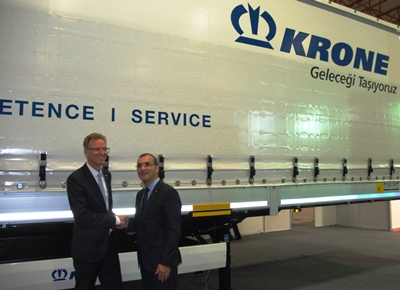 Avrupa’nın lider treyler üreticilerinden Krone, Uluslararası Lojistik Fuarı Logitrans 2016’da en çok ilgi gören modellerinden Mega Liner Huckepack’i sergiledi. Krone Türkiye CEO’su Rıza Akgün, Krone standını ziyaret eden Almanya Ulaştırma Bakanlığı’ndan Dr. Gerhard Schulz’a Krone’nin Türkiye yatırımlarıyla ilgili bilgi verdi.