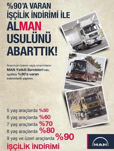 Bunlarla birlikte geleneksel olarak, yıllardan beri öncülüğünü yaptığımız kapsamlı bakım paketi hizmetlerimiz ile MAN marka araçların hem en doğru ve en yetkin servis hizmetini almasını sağlıyoruz. Bu sayede de müşterilerimizi değişken maliyetlere karşı koruyoruz. Almanya merkezden aldığımız desteklerle bu hizmetleri müşterilerimize çok uygun fiyatlarla sunuyoruz.