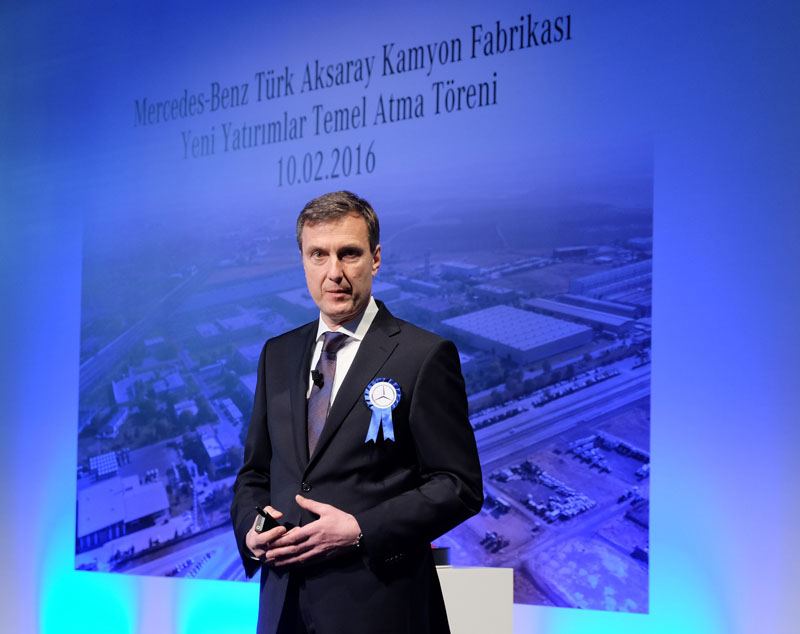 Mercedes-Benz Türk Finansman ve Controlling Direktörü Stefan Baasner ise, “Bugün bu basın toplantısı ve temel atma töreniyle başlattığımız 113 milyon Avro’luk yeni yatırım programı, Aksaray Fabrikası için yeni bir sayfa anlamına geliyor. Aksaray Kamyon Fabrikası teknik donanımı, bilgi seviyesi, tecrübeli yöneticileri ve çalışanlarıyla daha fazlasını yapmaya hazır. Bu yatırımla ihracatımıza ciddi bir ivme kazandırmak istiyoruz. Uzun yıllardır Türkiye’de kamyon üretiminin içinde bulunuyor, 6 ton ve üzeri kamyon pazarında son 14 yıldır aralıksız pazar liderliğimizi koruyoruz. 2015 yılında, yine kendi rekorumuzu kırarak 19.060 adet kamyon satışı gerçekleştirdik. Mercedes-Benz Türk olarak biz Türkiye’ye ve Türk insanına inanıyoruz. Bu inancı başarılı işlere çevirmek için bugün sizlerle birlikte yeni bir adım atıyoruz.” diye konuştu.