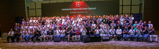 Faaliyetlerine başladığı 1967 yılından beri Türkiye’nin sosyal ve ekonomik geleceğine değerli katkılar sağlayan Mercedes-Benz Türk, 24 – 26 Eylül tarihleri arasında Kıbrıs Concorde Luxury Resort’ta kamyon satış bayileriyle bir araya geldi. Her çeyrek sonunda bayileriyle bir araya gelerek sektör ve gündem değerlendirmelerinde bulunan Mercedes-Benz Türk, bu yılki mottosunu Cumhuriyetin 100. yılı sebebiyle “Cumhuriyetin Değerlerini Gururla Taşıyoruz” olarak belirledi. Mercedes-Benz Türk, gerçekleştirdiği bayi toplantısında önümüzdeki dönem hedefleri üzerine konuştu. Türkiye’nin dört bir yanından Mercedes-Benz Türk bayi genel müdürleri ve çalışanlarının katılımıyla gerçekleşen toplantıya, Mercedes-Benz Türk Kamyon Satış ve Pazarlama bölümünün ev sahipliğinde şirket yöneticileri de katıldı.