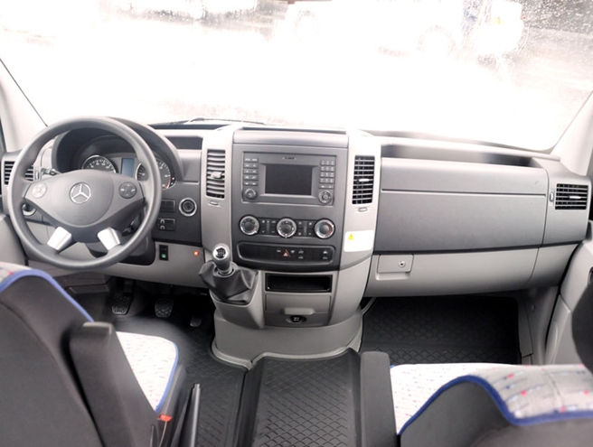 10+1 Sprinter Minibüsler standart ve lüks donanım seviyesi olarak 2 farklı seçenek ile satışa sunuluyor. Lüks paket kapsamında 5,8 inch ekran görüntülü Audio 15 radyo, kromajlı ön panjur, halojen sis farı, viraj aydınlatmalı bi-xenon farlar, far yıkama sistemi, hız sabitleyici, kilitlenir torpido gözü standart olarak sunuluyor.