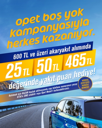 Türkiye’nin müşteri memnuniyetinde lider markası olan OPET, müşteri deneyimini en üst seviyeye çıkarma hedefiyle düzenlediği kampanyalarına devam ediyor. “Boş Yok Kampanyası” kapsamında farklı günlerde 3 kez tek seferde yapılacak 600 TL ve üzeri akaryakıt alışverişlerinde 25 TL, 50 TL ve 465 TL değerindeki ödüllerden biri anında hediye ediliyor.