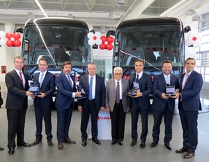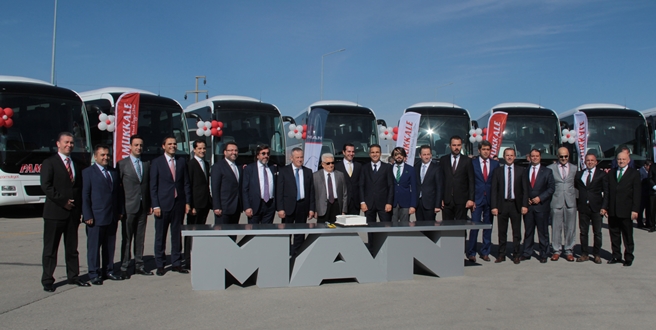 MAN’ın Ankara Akyurt’taki otobüs üretim tesislerinde gerçekleştirilen törene MAN Kamyon ve Otobüs Ticaret A.Ş. adına Genel Müdür Tuncay Bekiroğlu, Otobüs Satış Direktörü Can Cansu, TopUsed Satış Direktörü Aydın Yumrukçal, TopUsed Satış Müdürü Cüneyt Ergün ile Otobüs Bölge Koordinatörü Emrah Albustanoğlu katıldı. Törende kısa süre önce MAN Truck & Bus Güney Afrika Cumhuriyeti Kamyon Satış Direktörlüğü görevini üstlenen D. Eren Gündüz’ün yanı sıra Şensan Otomotiv ve VDF (Volkswagen Doğuş Finans) yetkilileri de hazır bulundular. Pamukkale Turizm’den de Yönetim Kurulu Üyeleri Cafer Sadık Bababalım, Turhan Bababalım, Mazlum Bababalım, Ahmet Bababalım, Sadık Bababalım, Pamukkale Turizm Genel Müdürü Mustafa Özdalgıç, Anadolu Ulaşım Genel Müdürü Mehmet Ali Akçın’ın yanı sıra Pamukkale Turizm Bölge Koordinatörleri ve Bölge Müdürleri de teslimat törenine katıldılar.