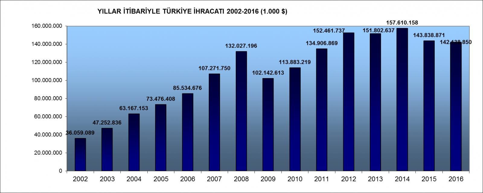 Türkiye 2016 yılında 142,6 milyar $ ihracat 198,6 milyar $ tutarında da ithalat gerçekleştirdi. Bu rakamlara göre ihracatımız bir önceki yıla oranla %0,84 azalmış olduğu görülmektedir. Ancak dış ticaret açığımız açısından sevindirici bir gelişme olarak da değerlendirilebilen bir şekilde ithalatımız da %4,17 oranında azalmıştır. Böylece dış ticaret hacmimizin geçen yıla oranla %2,81 gerilediği görülmektedir. Bu rakamların sevindirici yanına bakarsak; dış ticaret açığımız %11,74 azalırken ihracatın ithalatı karşılama oranı %69,4’den %71,8’e yükselmiştir.