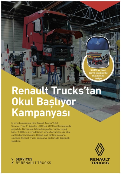 Renault Trucks, kullanıcılarının okul çağındaki aile bireylerini mutlu etmek için yeni bir kampanya başlattı. Tüm Renault Trucks Yetkili Servisleri’nde 01 Ağustos – 30 Eylül 2023 tarihleri arasında geçerli olacak kampanya dahilinde yapılan “işçilik ve yağ hariç” 5.000 TL ve üzerindeki her servis harcaması, okul çantası kazandırıyor.