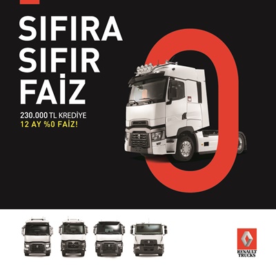 Renault Trucks, uzun yol çekicilerinden ağır şantiye kamyonlarına kadar tüm modellerinde yıl sonuna kadar 230.000 TL krediye 12 ay, yüzde 0 faiz avantajı sağlıyor.