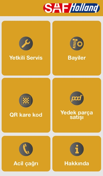 bulundukları bölge veya güzergahlarında SAF-HOLLAND’ın yetkili bayi ve servis ağına en kolay ve en hızlı şekilde erişimini sağlıyor. Uygulamanın Türkçe, Almanca ve İngilizce dillerinde kullanımı bulunuyor. Aynı zamanda aracın bulunduğu lokasyonda 80 km çapında en yakın Yedek Parça Bayisine de yönlendirme yapılıyor. Ayrıca uygulama QR-Code Tarayıcı özelliği sayesinde yolda olduğunuz her an SAF-HOLLAND ürünlerinizdeki mevcut yedek parçaları tanımlayabilmenize olanak sağlıyor. Böylece bayilerden gerekli orijinal yedek parçanın kolayca ve doğru bir şekilde tedarik edilmesi mümkün oluyor.