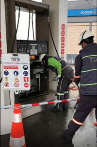 Yönetmelik metnince her yıl genel merkezimizde yangın, dökülme, fışkırma tatbikatları yapmaktayız. Bunların yanı sıra sahada menhol içi ve pompa altı çalışmalarımızda yangın, dökülme ve fışkırma tatbikatları da yapmaya başladık. Bu tatbikat senaryomuza bir kişi menhol içerisinde veya pompa altında çalışma yapıyor, diğer kişi ise ona yardım ediyor. Çalışma yapan personel bağırarak yakıtın ortaya çıktığını söylüyor. Diğer personel ise hızlı bir şekilde Acil Stop butonuna basıyor gibi yanına dokunuyor ve yangın söndürücüsünü alıp çalışma alanına dönüyor.