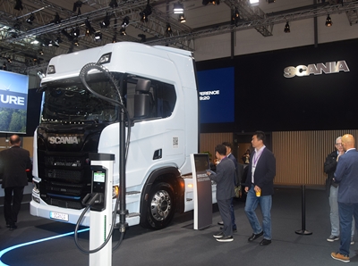 Scania uzun zaman önce çalışmalarına başladığı elektrikli araç modellerini de fuardaki standında sergiledi. Full elektrikli şehir içi dağıtım kamyonu öne çıkan model olarak dikkat çekti. 18 ton taşıma kapasitesi 3 dingil ile 25-26 tona çıkabilirken, 450 kw elektrik motorlu 4×2 çekici ile 4 saatlik çalışma süresinde ortalama 80 km süratle 350 km ye kadar menzile sahip. 45 dakikalık sürücü molasında yüzde 80’e varan şarj ile 300 km daha mesafe kazanabiliyor.