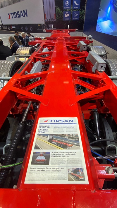 Tırsan, fuarda Avrupa İnovasyon Ödüllü sekizgen kirişli T.SHG AMH konteyner taşıyıcı aracını sergileyerek, dayanıklılığı ve operasyonel verimliliği bir araya getiren patentli sekizgen kirişli şasi tasarımını ziyaretçilere tanıttı.