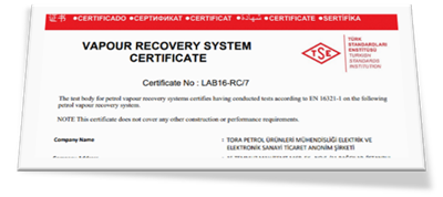 Bu kapsamda TORA, Türk Standartları Enstitüsü tarafından TS EN 16321-1 (Petrol buharı geri kazanım sistemlerinin onay etkinliğinin değerlendirmesi için test metotları) standardına göre aşağıdaki testleri başarı ile geçerek sertifikaya almaya hak kazanmıştır.