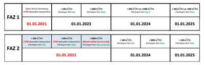 Benzin ve Naftanın Depolanması ve Dağıtılmasından Kaynaklanan Uçucu Organik Bileşik Emisyonlarının Kontrolü Yönetmeliği ve Cumhurbaşkanı kararnamesine göre yeni kurulan akaryakıt istasyonlarında 1 Ocak 2021 tarihinde başlayan buhar geri kazanım sisteminin kurulması zorunluluğu, mevcut istasyonlarda FAZ 1 için 1 Ocak 2023, FAZ 2 için ise 1 Ocak 2024 olacaktır. Geçiş takvimi aşağıdaki gibidir.