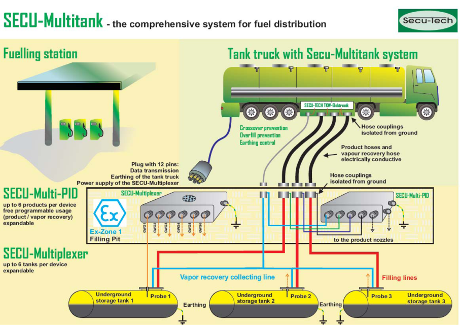 Akaryakıt istasyonunda ise yeraltı tanklarının dolum ağızlarına takılan P.I.D (Product Idendification Device) ler sayesinde her tanka bir ürün tanımlanıyor. Tanker istasyona gelip güvenli dolum ekipmanlarını bağladığı zaman (iletken dolum hortumu, dolum dirseği vb.) Tankerde bulunan kontrol ünitesi bağlanılan tankı tanıyarak ürün eşleştirmesi yapıyor. Eğer ürün doğru olarak eşleşmez ise doluma izin verilmiyor. Ve kilitlenen dolum mekanizması açılmıyor.