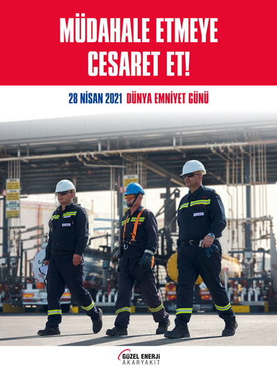 Güzel Enerji Akaryakıt A.Ş. Dünya İş Sağlığı ve Güvenliği Günü’nü, geçen sene olduğu gibi bu sene de pandemi koşulları nedeniyle video konferans yöntemi ile genel merkez, istasyon ve tesis çalışanlarıyla kutladı. Her türlü çalışma ortamında, emniyetli çalışma düzenini sağlayıp, iş faaliyetlerinin daha güvenli bir şekilde sürdürülmesine dikkat çekmek amacıyla gerçekleştirilen kutlamanın bu seneki teması “Müdahale Etmeye Cesaret Et!” olarak belirlendi. Konferansta tüm çalışanların iş güvenliğine dair konularda aktif rol almasının öneminin altı çizildi. Ayrıca, Covid-19 sürecinde alınan ve son dönemdeki vaka artışları nedeniyle tekrar büyük önem kazanan önlemlere değinildi.