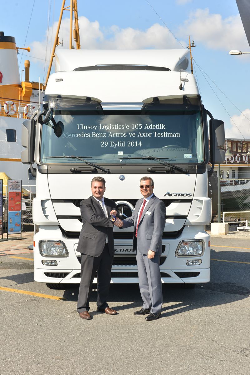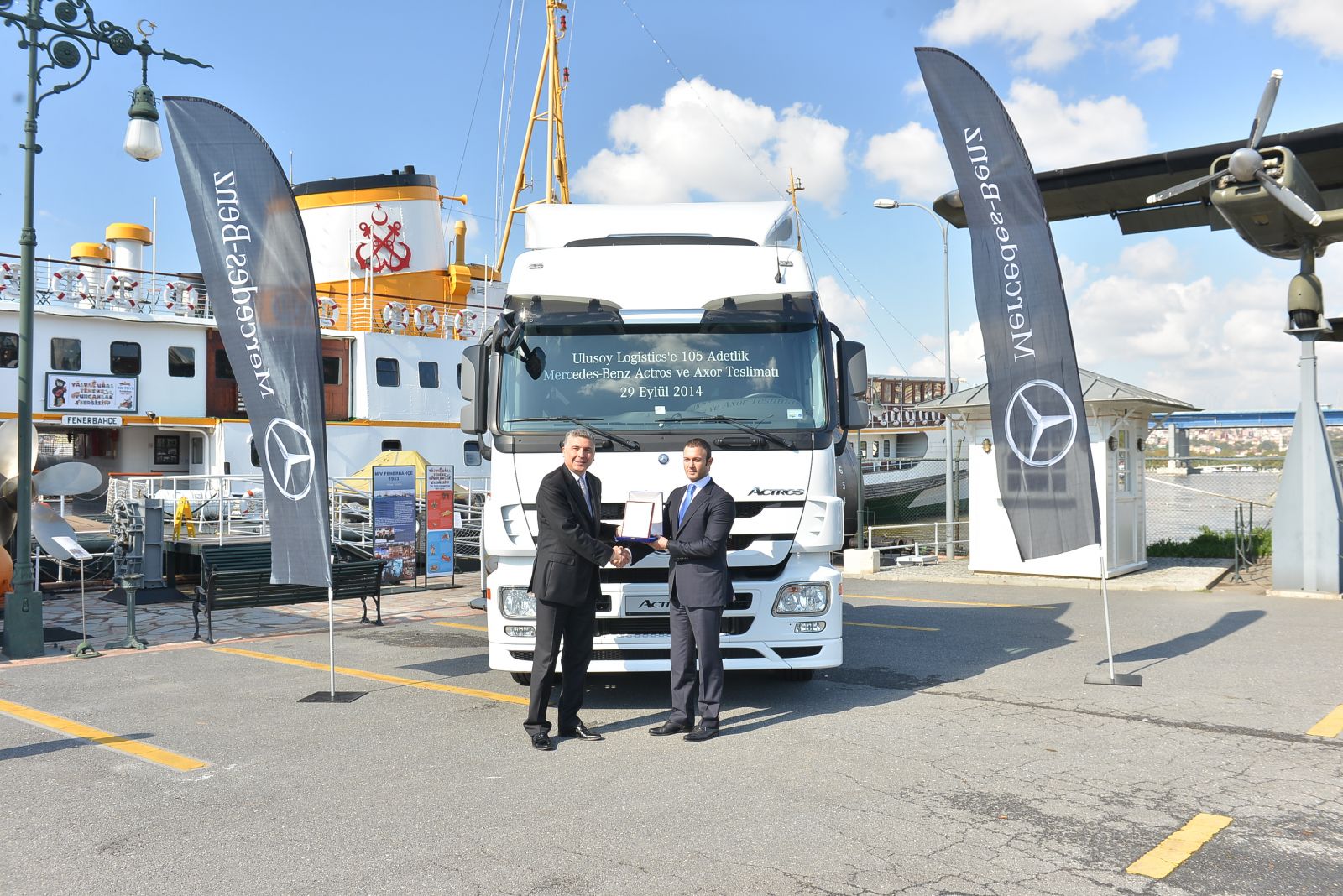 Lojistik sektörünün öncü firmalarından Ulusoy Logistics, tercihini Mercedes-Benz’den yana yaptı. Ulusoy Logistics, Mercedes-Benz Türk yetkili bayii Koluman Motorlu Araçlar aracılığıyla yapılan satışla 65 adet Mercedes-Benz Actros 1844 LS çekici, 25 adet Axor 1840 LS çekici, 15 adet de Axor 3229 C kamyon olmak üzere toplamda 105 adet aracı törenle teslim aldı.