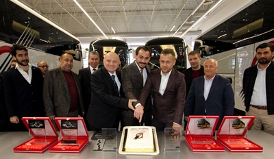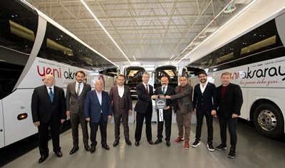 MAN Yeni Lion’s Coach 13 metre ve 41+1+1 kişilik oturma düzenine sahip yeni versiyonu ile sektör temsilcilerinde oluşturduğu büyük beğeni ve hayranlık, talebe dönüştü. Beyaz renkte üretilen 2+1 VIP oturma düzenli 4 adet MAN Yeni Lion’s Coach, Türkiye seyahat sektörünün Aksaray merkezli köklü firması Yeni Aksaray Seyahat’e satıldı. Uzun yıllardır Aksaray halkına Neoplan Starliner ve Neoplan Cityliner otobüsleri ile yüksek standartlarda hizmet veren Yeni Aksaray Seyahat Ailesi, 2019 yılında sürdürdüğü yeni yatırımlarını da MAN yeni Lion’s Coach ile yapmaya karar verdi. Son yıllarda özmal olarak sadece MAN ve Neoplan otobüslerini tercih eden firma, 2019 yılı içinde 4 adet MAN Yeni Lion’s Coach alma kararı aldı. Dört araçlık siparişin ilk 2 adet 13 metrelik MAN yeni Lion’s Coach 4 Ocak 2019 Cuma günü düzenlenen özel bir törenle Yeni Aksaray Seyahat’e teslim edildi. MAN Ankara fabrikasında düzenlenen teslimat töreni, Yeni Aksaray Seyahat’in sahipleri Nurettin Yumuşak, İbrahim Yumuşak ve Serhat Yumuşak’ın katılımı ile gerçekleşti. MAN Kamyon ve Otobüs Ticaret A.Ş. adına Otobüs Satış Direktörü Can Cansu ve Otobüs Bölge Koordinatörü Ufuk Demirer’in ev sahipliğinde düzenlenen törende, MAPAR Yönetim Kurulu Başkanı Yalçın Şahin, Yönetim Kurulu Üyesi Hıdır Erdi Şahin ve Genel Müdür Tanju Nayır da hazır bulunarak, firma sahiplerine plaket takdim ettiler.