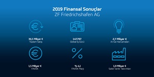 ZF Friedrichshafen AG, 2019 yazında revize edilen yıllık hedeflerine zorlu bir ortamda ulaştı. 36,5 milyar Avro olan şirket cirosu (para birimi ve birleşme & satın alma etkilerine göre ayarlanmıştır) bir önceki yılın 36,9 milyar Avroluk (organik olarak eksi yüzde 1,9) rakamının biraz altında kaldı. Düzeltilmiş faaliyet karı 1,5 milyar € (2018: 2,1 milyar €) ve düzeltilmiş faaliyet kâr marjı yüzde 4,1(2018: yüzde 5,6) oldu. Aralık sonunda ZF’nin dünya çapında 147.797 çalışanı bulunuyordu. COVID-19’un doğurduğu sonuçlarla başa çıkmak için acil önceliklerinin yanı sıra ZF, geleceğin mobilite ihtiyaçlarını da şekillendirmek için “Yeni Nesil Mobilite” stratejisinin uzun vadeli hedeflerini takip ediyor.