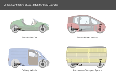 ZF, geleceğin şehir içi mobilite çözümlerini desteklemek için temel araç tasarım gereksinimlerini karşılamak üzere geliştirilmiş ve kullanıma hazır, esnek araç platformu, Akıllı Yürür Şasi’yi (IRC) sunuyor. Platform, bir aksa entegre elektrikli tahrik sistemini; yenilikçi, çevik yapıdaki bir şasiyi, gelişmiş bir direksiyon sistemi ve bütün şasi işlevlerini koordine eden, elektronik bir kontrol birimi ile birleştiriyor. Akıllı bir biçimde birbirine bağlanan bu mekanik sistemler, IRC’yi otonom şehir içi sürüş için mükemmel biçimde donatmışlardır. Ön ve arka aks arasındaki tamamen düz zemin, hemen hemen her araç gövde tasarımına uymaktadır. Bu şekilde IRC, ister şehir içi yolcu ister yük taşımacılığına yönelik yenilikçi elektrikli araçlar geliştirmek için ideal ve oldukça esnek bir platformdur.